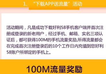 注册后,完成手机,邮箱,实名三项认证,并下载好利58app登录,再坐等10个工作日内100m手机流量到账。