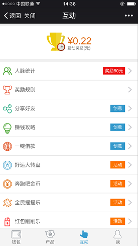 3.点击“互动”即可进入活动页面,其中“好运大转盘”和“奔跑吧金币”这两个活动可以每天都可以参与,“全民摇摇乐”注册和实名认证时各送一次抽奖机会,这3个活动可以抽到体验金或者现金,至于“红包削削乐”抽到的红包只能投资抵用现金。
