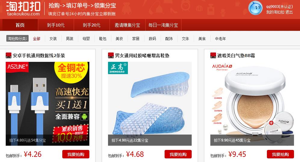 淘扣扣是一个淘宝购物返集分宝的网站,上面推荐的都是一些比较便宜的商品,重要的是现在新用户注册免费送15集分宝,每天签到得1集分宝,完成“每日一淘集分宝”任务可得10集分宝,这个任务很简单,跟签到一样!