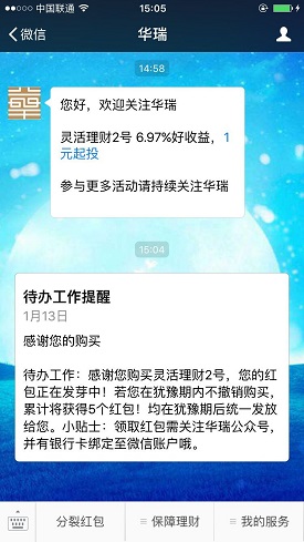 华瑞是首家获得基金销售资格的全国性保险中介公司,目前正联合一仟金融举办“发芽红包,助阵新年好彩头!”活动,新老用户至少投资1元购买理财产品后,10天后即可得到5个微信红包,每个金额都在1元以上!