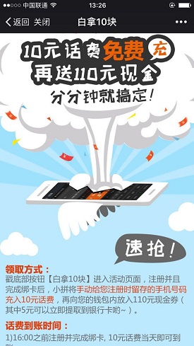 君融贷联合拼划算正在举办新人见面礼的活动,通过关注拼划算的微信后推送的活动页面完成君融贷的注册,即可免费获得10元话费和5元现金,现金奖励可直接提现。本站之前推荐过君融贷的活动,因此老用户这次就没办法参与这个活动啦!