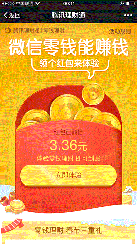 腾讯旗下的理财通正举办微信零钱理财全民抢红包活动,每个用户都可免费领取到1.68元红包,随便分享下,即可自动翻倍到3.36元红包,然后通过微信零钱支付0.01元后红包就会变为现金,可直接提现到银行卡。