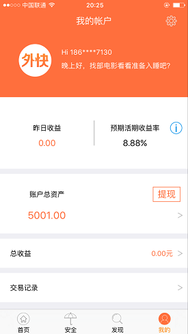 投资成功后,即可看到一共有5000元体验金了,7天后会自动产生8.52元利息,到时直接提现银行卡即可!