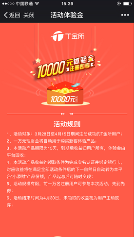 T金所是TCL互联网金融服务(深圳)有限公司,看这背景应该还不错,目前新用户注册后即可免费领取10000元体验金,预计15天产生19.73元利息,据说可直接提现,名额有限,支持的银行卡较少,抓紧时间上车!