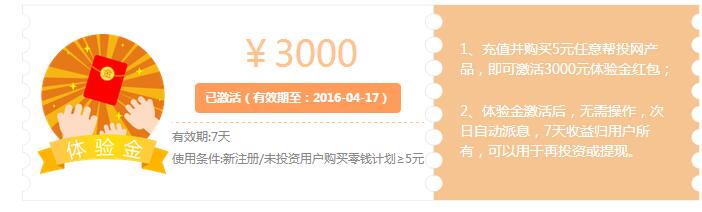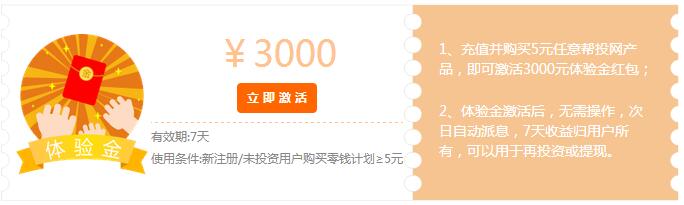 帮投网是南京帮投信息科技有限公司旗下的理财平台,目前新用户注册后会赠送3000元体验金,投资5元“零钱计划”即可激活体验金,预计7天可产生5.3元利息,可直接提现,扣除2元手续费,加上充值的5元,最终可到账8.3元!