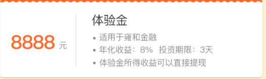 金交所是八青社国际投资(北京)有限公司旗下一款理财app,目前新用户注册后可免费领取8888元体验金,预计3天可产生5.84元利息,据说是可以直接提现,但到时会不会出现一些幺蛾子就不好说了,毕竟现在无耻的平台太多,伤透你我的心了。