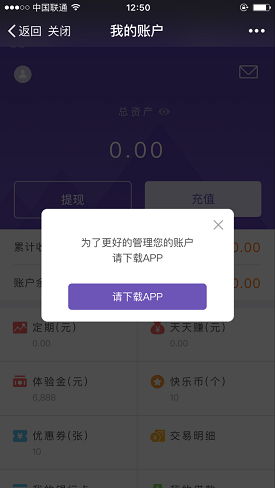 然后完成实名认证可得1888元体验金,完成银行卡绑定可得5000元体验金,点击“账户”-“体验金”会提示你下载快快贷app: