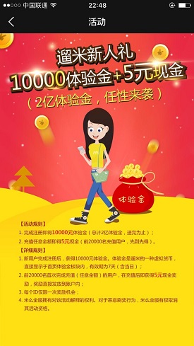 注册为会员,即可获得10000元体验金,我绑定银行卡并充值了1元现金,但并没有得到5元的奖励,说明5元奖励这个活动已经结束了。