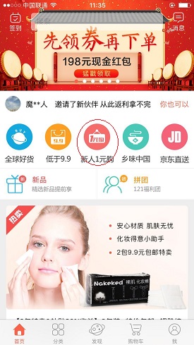 打开后,输入刚才领取红包的手机号完成登录,点击“新人1元购”如下图:
