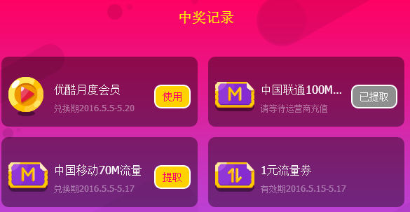 根据不同的奖品,各自领取即可。如果优酷的会员,点击“使用”不跳转到相应的页面,可以在“我的淘宝-我的优惠信息-优惠卡券-网店优惠券-商品券”找到,点进去后支付0.01元即可得到一个月的优酷会员!