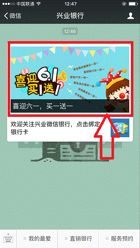 1.打开微信,搜索:兴业银行(微信号:cibebanking)关注,点击推送来的活动信息进入,如下图: