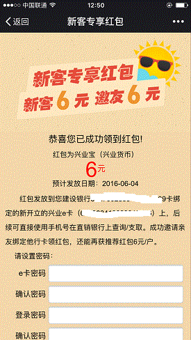 几天没推荐现金活动了,一些朋友可能不爽了,兴业银行也知道你们在抱怨了,特在六月针对新用户送出6元红包活动,存入66元即可激活红包。存入的66元,可立即提现到银行卡,秒到账,银行的活动,完全放心!