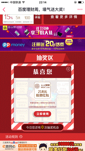 我在电脑上,毛都没抽中,在手机上抽中了人人聚财218元投资红包,如下图: