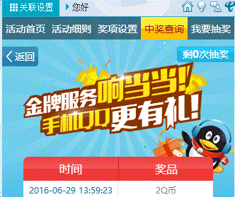 7.点击“我要抽奖”开始抽奖,一般都能抽中Q币,如图,在中奖记录可看到我抽中了2Q币。