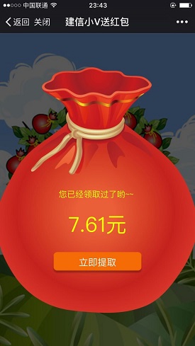 打开微信,搜索:建信基金(微信号:ccbfund),以前关注过的,千万记得要先取消再重新关注,否则只能和我一样领取几毛的红包。关注后,回复“大红包”,会自动推送活动信息,点进入抽取即可。