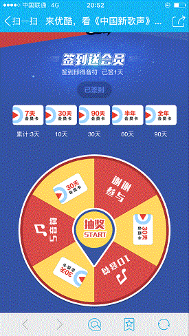 中国新歌声就是以前的中国好声音,目前联合优酷做了一个签到就送优酷会员的活动,累计签到的天数越多获得会员时间越长。网上虽然能搜到一些免费共享的优酷会员帐号,或者淘宝低价买一些帐号,但这类万人骑的帐号很容易被锁定,还是用自己的省心!