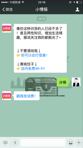 1.微信关注“小情报”(微信号:ixiaoqingbao),关注后,回复“冰桶”如下图:
