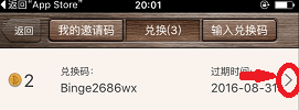 3.点击右下角箭头进入,选择“邀请与兑换”,输入兑换码“BINGE2686WX”即可再获得2个兑换币。