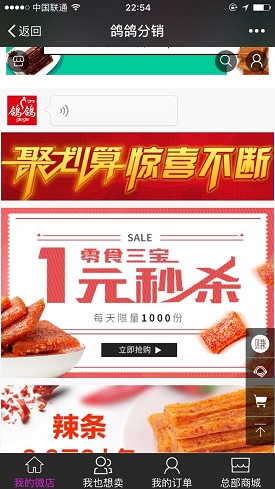 这个鸽鸽食品也是可以分销的平台,推广好友在里面买辣条,你可以赚取提成。如何推广好友呢?
