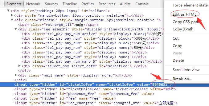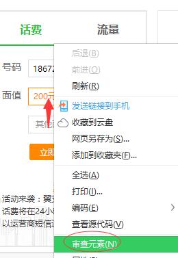 2.输入需要充值的手机号,选择200元的面值,鼠标箭头放在“200”那里点击右键,选择“审查元素”(我用的360安全浏览器)