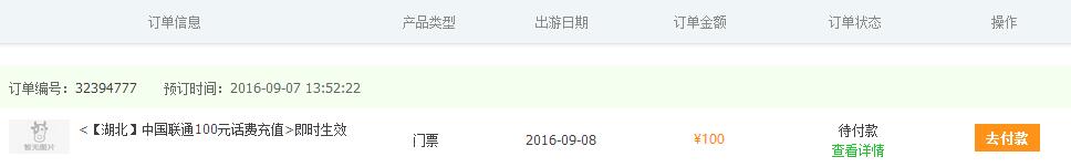 4.然后点击一下第二步那里的“立即充值”,不会自动跳转,但其实在“我的订单”里已经产生了100元话费的订单,如下图: