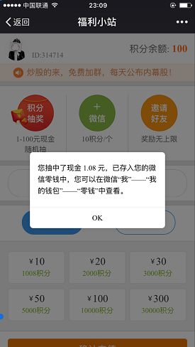 3.关注一个有10积分,关注10个也就是有100积分以后,点击“积分抽奖”即可100%获得1元以上的现金,直接存入你的微信零钱里。