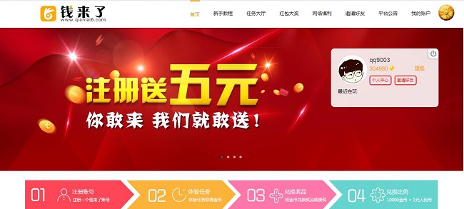 进去后,直接注册为会员即送5万金币(相当于5元现金),在“任务大厅”找个任务完成下,只要凑到10元以上即可提现了。