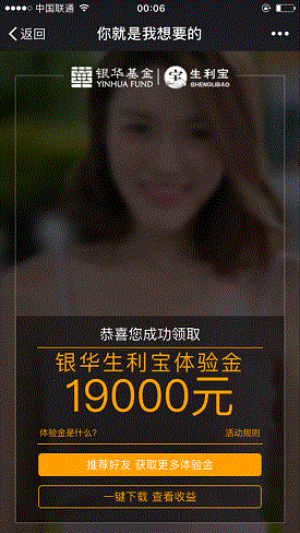 几个月前我推荐过银华生利宝,当时安装app后有10元话费。没想到真的到账了,而且现在活动还在继续。这次还额外免费赠送了20000元左右的体验金,预计7天有10元左右的收益。新老用户都可以领取,我是老用户,领到了19000元!