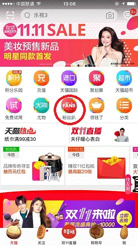 1.在手机上打开天猫app,点击“粉丝趴”