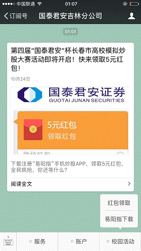 4.再微信里搜索“国泰君安吉林分公司”(微信号:gtjajl)关注后,点击右下角菜单栏“校园活动”-“红包领取”即可看到