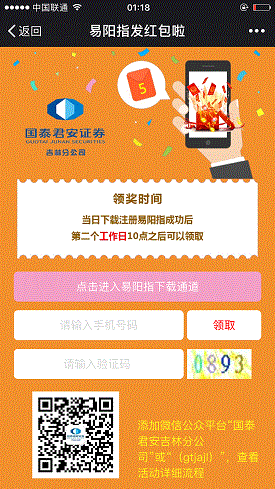 易阳指是国泰君安证券官方手机APP,目前新用户安装app注册后第二个工作日上午10点后可免费领取5元红包,看上去要求有点怪,但到时能顺利拿到奖励都不是问题,而且注册时只需要手机直接,不用绑卡,不用实名认证!