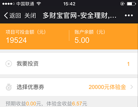 多财宝是深圳前海博益互联网金融服务有限公司旗下的理财平台。目前新用户注册后免费赠送20000元体验金,还可以抽取至少2元现金红包,体验标投标10天后预计产生6.57(实际3.83)元收益,到时再直接提现,无需抢标,无手续费!