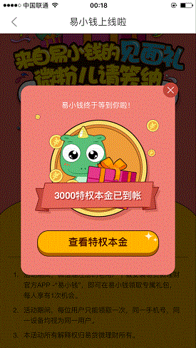 4.领取后,再回到上图的界面,点击“精彩活动”-“下载APP有礼”进去后,下载“易小钱”app,用刚才你注册的帐号登录,再领取3000元体验金(如果你是易贷微理财老用户,也可以领取这3000元体验金。)