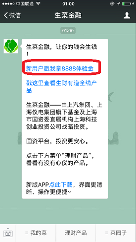 1.打开微信搜索“生菜金融”(微信号:shengcaijinrong),关注后,即可推送来活动介绍。(如果没推送,查看历史消息也能找到)