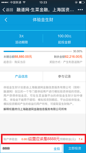 生菜金融是上海融道网金融信息服务有限公司旗下的理财平台,从11月3日开始,新用户注册后即送8888元体验金,投3天体验标后预计有7.4元收益,据说可直接提现。不知道为什么我已经是老用户,查了以前的文章也未曾推荐过,所以无法亲自参与了。