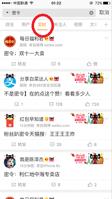 打开你手机微博,搜索“密令”即可看到有很多人分享出来了(记得选“实时”)。你要做的不停刷新,复制到手机淘宝或者天猫粘贴,搜索,拆红包!