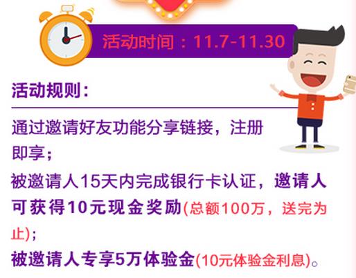 聚宝匯(汇的繁体字)是本站推荐过多次的一个平台,从11月7日开始,新用户注册免费赠送50000元体验金,投1天的体验标后可产生10元利息,可直接提现。以前举办多少活动,早提现到账了,每次差不多都是10元左右的奖励,所以没上的抓紧时间,不用等了。