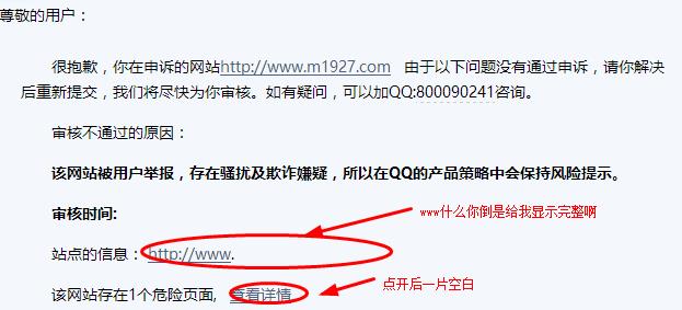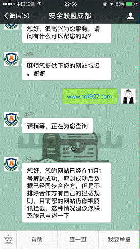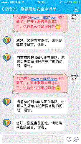 然后,在我网站找到一些方法,说可以通过“安全联盟”申诉,然后果然成功审核了,但过了几天依然提示,于是找到安全联盟客服: