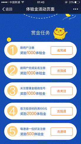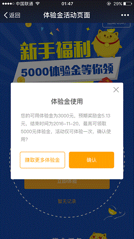 3.点击第一个“去完成”,注册为会员,然后再次扫描上图二维码,到这个页面领取1000元体验金。接着,同样完成第二步和第三步(关注他们微信号后,点击菜单栏“活动中心”-“领取1000元体验金”领取)。