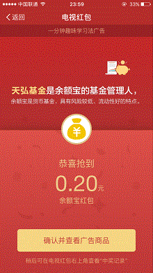 4.中了之后,记得点“确认并查看广告商品”这样你所中的红包才会转到你的余额宝里,如果你忘了点确认,可以在余额宝,点击“转入”会提示有多少红包,直接输入你的红包金额,转入即可。