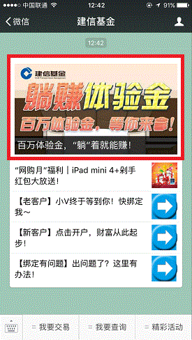 1.微信关注“建信基金”(微信号:ccbfund)后,点击“百万体验金”活动进入。