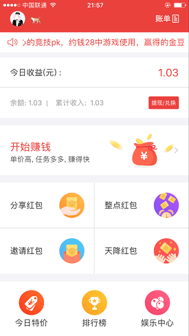 因为规定支付宝提现要收2%的手续费,我们还需要点击“开始赚钱”-“每日签到”(0.01-1元),点击“天降红包”(每天2次机会,至少0.02元)。