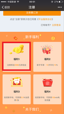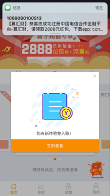 现在很多人看到体验金就觉得没什么意思,因为很多平台都耍赖过。不过翼汇财是中国电信合作的金融平台,这个背景还足够大吧!现在新用户注册即可免费获赠2888元体验金,投标后8天预计5.06元利息,不用抢标,可直接提现,无手续费!
