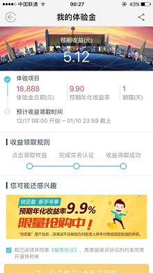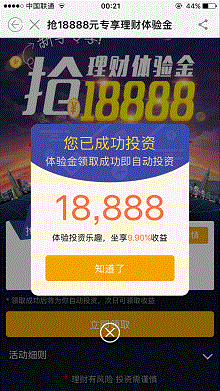去年的这个时候,快钱钱包正举办免费绑卡送30元活动,虽然当时等的很辛苦,但最终还是到账了,毕竟万达集团的,不给太说不过去了。现在新老用户都可以免费领取18888元体验金,预计1天可产生5.12元收益,可直接提现到银行卡!