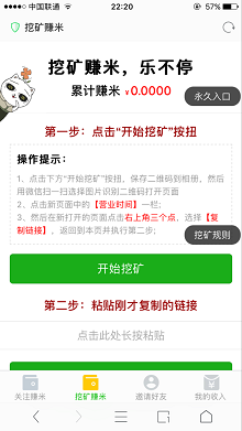 2.点击“挖坑赚米”,操作提示里写的很清楚了,先点击“开始挖坑”,再打开指定页面和复制指定链接,最后返回到这个页面提交即可。安卓和苹果的显示略有不同,大致方法一样。