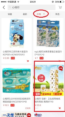 4.搜索你需要购买的商品,如下图,我想买23.8元包邮一提心相印的卷纸。