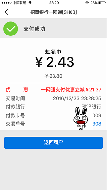 5.购买时,选择一网通支付,给我减去了21.37元,我实际只支付2.43元就买了这提纸。(有人说没减,不知道是什么原因,反正确保用一网通支付,而且那里显示有立减的优惠,最保险就是卡里留不超过10块钱!)