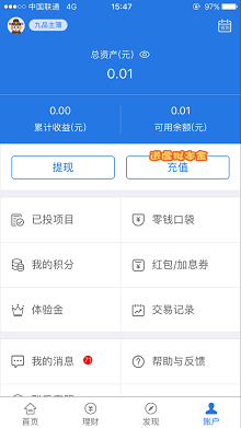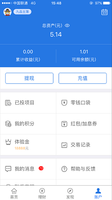 3.登录后,在“账户”可看到充值按钮上面写着“送虚拟本金”。充值1元即可获得18888元体验金,预计有4.13元收益。(因为我以前已经注册过这个平台,那时提现时账户非得留1分钱才行,所以余额一直剩着这1分钱。如果你和我一样以前注册过,但没有充值过,这次也可以参与这个活动)