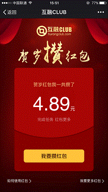 互融CLUB是上海益民互融金融信息服务有限公司理财平台,目前新用户注册后可免费领取一个微信红包金额随机,我领到了4.89元,规则上说这个红包可以直接发送到微信钱包里,只不过是在春节期间(2017年1月下旬)才发放。