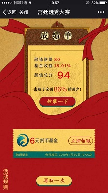 融通基金也是本站曾经推荐过的,举办过几次活动。现在新老用户关注官方微信后,可参与“刷脸抢红包!看看你的颜值多少钱?”的活动,开始刷了自己的脸只有50-60分,很受伤,于是刷了下吴彦祖的脸,有94分,抽到了6元货币基金。